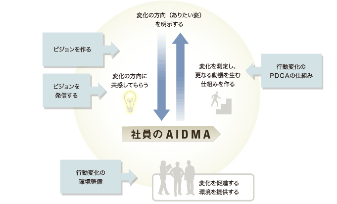 外向けのブランドと合致した内向けブランド/ビジョンを作り、社員のあるべき行動を誘発する仕組みを設計、実践します。